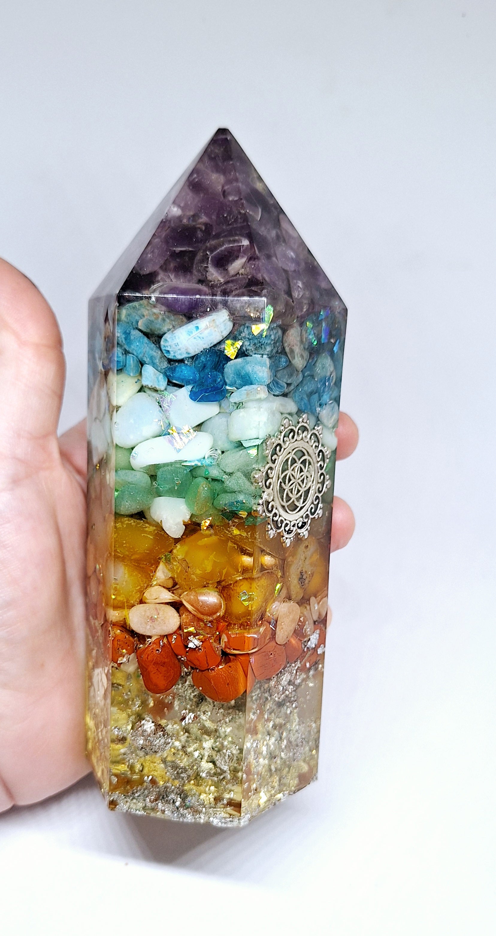 Orgonite de rééquilibrage global et d'harmonisation des chakras - Obélisque grand format, intentions de protection et de connexion